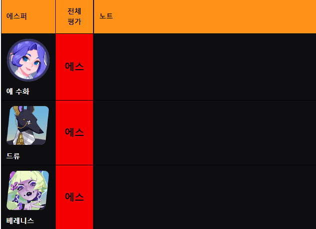 3성급에는 SS급은 없고 S급만 존재한다. 예수화, 드류, 그리고 베레니스를 추천하고 있다. 특히 드류의 경우에는 기본 캐릭터로 주기 때문에 꾸준히 키우기 좋은 캐릭터라고 생각이 된다. 해외 커뮤니티에서 이들을 평가하는 간략한 설명을 가지고 왔으니 참고하시길 바란다.