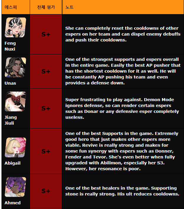 게임 가이드에서는 전체 평가 S+ 받은 5개의 에스퍼가 존재한다. 물론 지금 가지고 있는 에스퍼가 조금 있어서 덱을 구성하는데 꽤나 편해졌다. 특히 '장만'의 경우에는 사전예약 선택을 할 수 있는 영웅 중 하나이기 때문에 성능이 어떤지는 모르겠지만 게임 가이드의 평가를 보고 '장만'을 선택했다. 써보니까 뭐 쓸만해보인다. 물론 그래픽도 예쁘다.