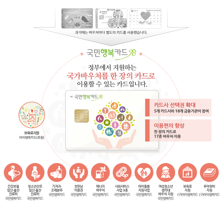 바우처는 국민행복카드라는 이름으로 모든 지원을 통합하여 관리하는 카드로 신청한다. 17총의 바우처를 하나의 카드로 진행할 수 있다는 것에 놀란게 아니라 지원을 17종을 해준다는 것에 한 번 놀라고 그 17종 중에 몇 개 모른다는 것에 충격을 또 받는다. 차근차근 알아봐야겠다.