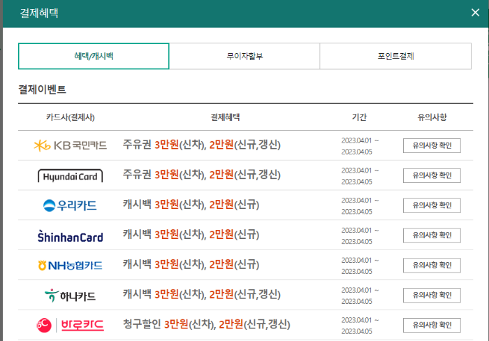 결제 이벤트도 항상 마감 임박이지만, 매주 하고 있기 때문에 크게 걱정하지 않아도 된다. 신규 갱신의 경우 결제 혜택이 카드사마다 다를 수 있다. 그러니 잘 확인하고 조금이라도 이득이 되는 곳에서 결제를 하면 좋다. 그러면 몇 초 걸리지도 않는 자동차보험 갱신, 싸게 한 번 해보도록 하자.