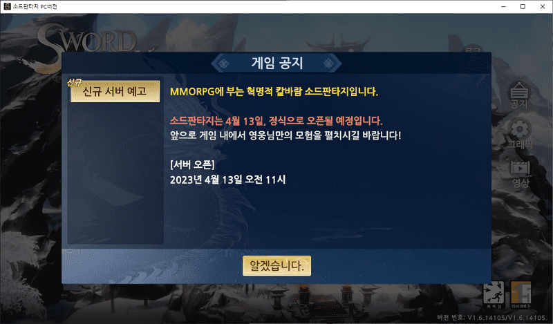 RPG 게임에 상처를 많이 받아서 할 게임이 많지 않아 사전 예약을 자주 하고 있다. 이번에 소드판타지가 오픈을 하루 앞두고 있다. 오픈 시간은 2023년 4월 13일 (목), 11시이다. 소드판타지는 PC버전의 정식 클라이언트를 지원하고 있기 때문에 굳이 핸드폰으로 할 필요는 없다.