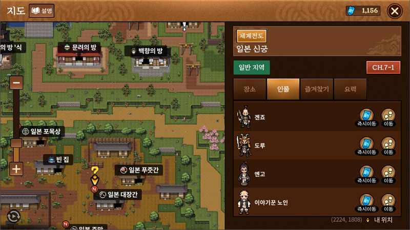 퀘스트에 NPC를 찾아가는 버튼이 없어서 그런지 어디있는지 한참을 찾아야한다. 한참까지는 아니고, 그냥 조금 귀찮을 뿐이다. 일본 유물의 이야기를 진행하는 이야기꾼 노인은 '일본 신궁'에 자리잡고 있다. 대부분 걸어다니지는 않고 순간이동 비서를 사용하기 때문에 '세계전도 - 일본신궁 - 이야기꾼 노인' 즉시 이동으로 찾을 수 있다.