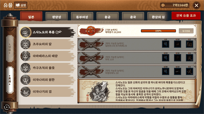스사노오의 폭풍 유물 탐구: 스사노오의 바람 50개 (체력 증가 20,000)