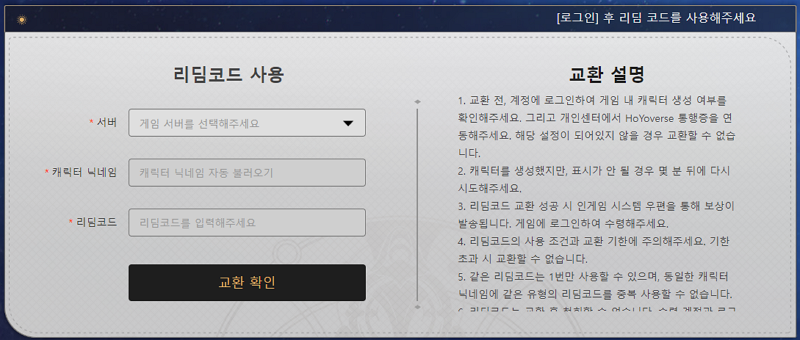 리딤 코드의 경우 대부분 그렇겠지만 동일한 캐릭터 닉네임에는 동일한 리딤코드를 사용할 수 없다. 교환 후 당연히 철회할 수 없다는 것은 덤이다. 보통 쿠폰 교환하는 것과 동일한 안내 내용이니 크게 걱정하지 않아도 된다.