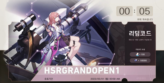 | HSRGRANDOPEN1 | 2023년 4월 25일 ~ 5월 1일, 00:59까지 | 성옥 100개, 머니 50000 |