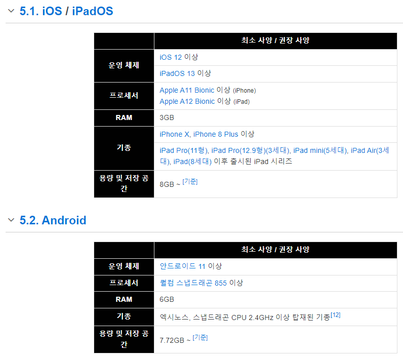 나무위키에 모바일 관련한 사양은 잘 나와있다. 안드로이드 유저로, 굉장히 어렵게 표시되어 있어서 조금 찾아보았다. 프로세서 퀄컴 스냅드래곤 855 이상이면 갤럭시 S10 이상급으로 생각하시면 된다. 아이폰의 경우에는 기종도 예쁘게 표시되어있는데 역시 글로벌한 회사인지 갤럭시 기종은 표시를 해주지 않고 있다.