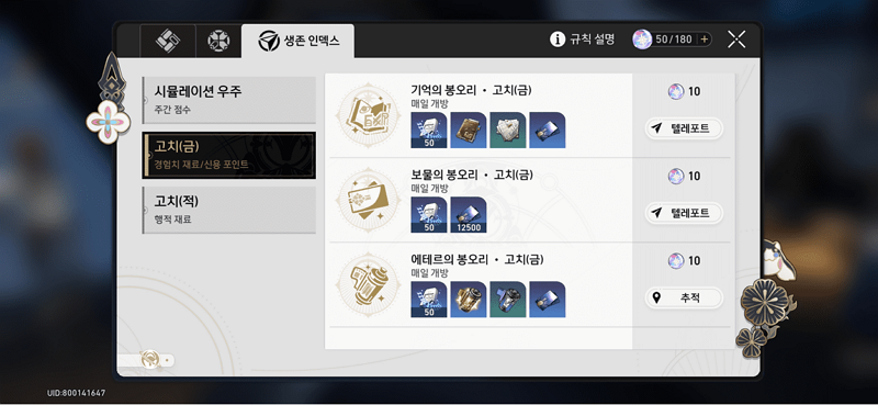내가 가장 좋아하는 마일리지 쌓는 방법인 전리품과 차원 저금통 수집이다. 마일리지 진짜 쥐똥한큼 주기는 하지만 상자를 모으면서 하나의 맵은 완결 지었다는 생각이 든다. 그만큼 도감작은 내 게임에서 없으면 안되는 요소이긴 하다. 붕괴 스타레일에도 많은 도감과 업적이 있기 때문에 많이 돌아다니고 정리해보려한다.