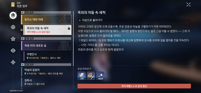 개척 임무를 쭉 밀다가 개척 레벨에 막혀서 서브 퀘스트를 하는 분들도 있고 동행이나 모험 임무가 눈에 보이는게 싫어서 빠르게 즉각즉각 하시는 분도 있다. 어떤 편이든지 상관없다. 어차피 서브 퀘스트의 이야기는 별도의 이야기로 풀어나가기 때문에 어떤 것을 먼저하는지는 중요하지 않다. 다만, 무조건 해야한다는 것이 중요하다.