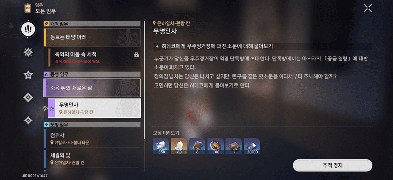 붕괴 스타레일에는 '개척 레벨'이라는 것이 존재한다. 왜 있는지는 모르겠지만 보통 컨텐츠 소비 속도를 늦추는데 많이 사용한다. 개척 레벨이 도달하지 않고서는 메인 개척 임무를 진행할 수 없다. 레벨 컷이 존재하기 때문에 해당 레벨까지 개척 레벨을 올려서 다음 임무를 진행해야한다.