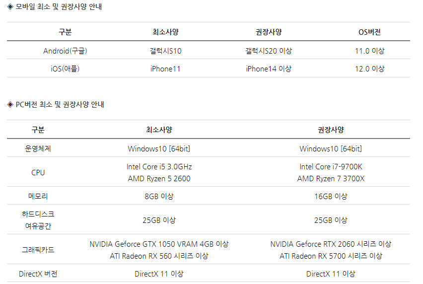 사양 보자마자 미쳤다라는 소리가 절로 나온다. 일반적인 게임과는 아예 차원이 다른 수준의 사양이다. 모바일만 보더라도 갤럭시 S20이상이 권장 사양이다. 사실 갤럭시 S10 이나 아이폰 11은 꽤나 오래된 폰이기 때문에 진짜 말 그대로 돌리가만 하는 폰 수준이다. 결국 갤럭시 S20 이상을 맞춰야 하는데, 이야. 요즘 폰 게임 치고, 아니 요즘 폰게임이라 그런지 사양이 어마무시하다. 모바일 용량이 5기가 정도 되는 것에는 이유가 있었다.