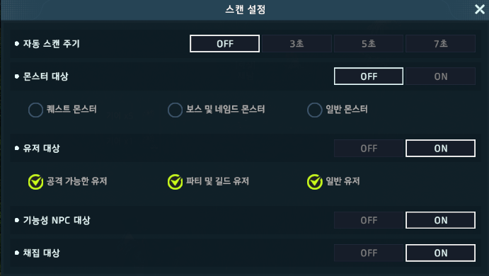 스캔의 옵션을 걸지 않으면 지저분해서 보기가 힘들다. 스캔의 설정에 들어가면 몬스터, 유저, 채집 등 다양한 옵션을 줄 수 있기 때문에 본인 취향에 맞춰서 스캔하면 된다. 지금 당장 필요 없더라도 주위에 있는 채집 대상을 모두 채집한다면 언젠가는 다 쓸모있기 때문에 하루에 한 20분 정도는 다양한 채집물을 채집해보는 것은 어떨까?