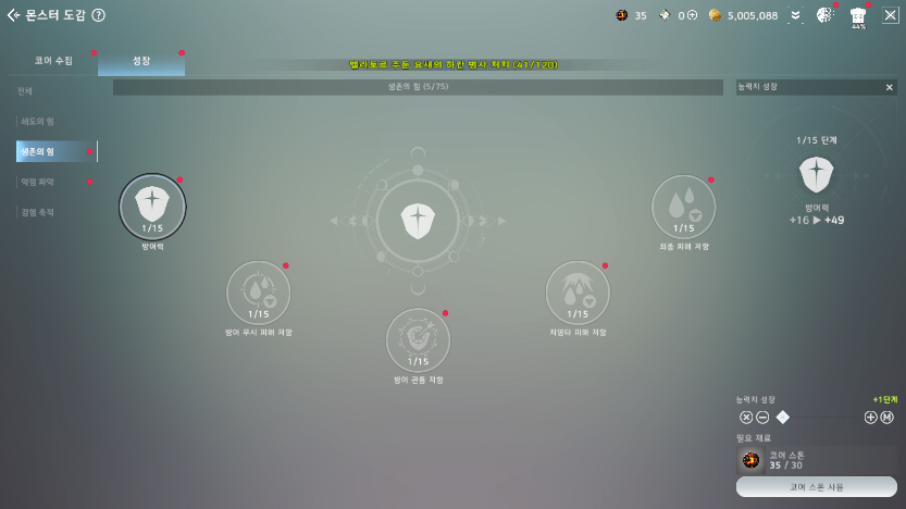 쇄도의 힘, 생존의 힘, 약점 파악, 경험 축적 등 15단계까지 성장할 수 있기에 이 수치를 무시하기는 쉽지 않다. 자동사냥이 몬스터 도감만 채워주는 것은 아니다. 우리가 성장에 필요한 슈트의 업그레이드나 강화칩, 제작 재료, 장비 수집까지 가능하기 때문에 1석 2조의 역할을 부여한다. 그러기에 몬스터 도감을 모두 채운다는 목표로 부가적인 성장도 같이 즐길 수 있다.