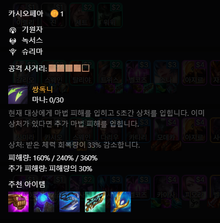 카시오페아는 마나 30이기에 블루가 들어간다면 마나 20으로 효율 33%를 자랑하는 아이템이다. 쌍독니의 스킬중에 특이사항은 마로 상처 (치유감소)가 있는 경우에 추가 데미지를 부여한다. 하지만 어차피 스킬 한 번 쓰고나면 그 기물은 치감이 되기 때문에 굳이 초가스한테 태양불꽃 망토를 주지 않아도 된다. 있으면 좋다는 뜻이다.