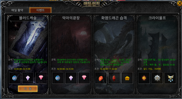 - 블러드 캐슬 (경험치, 축복의 보석, 영혼의 보석)