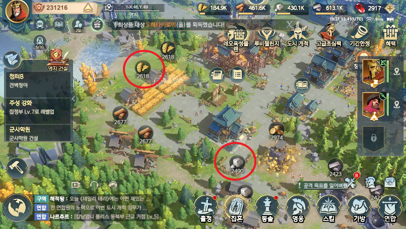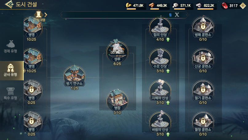 그냥 개인적인 생각이긴 하나 건물의 우선순위가 그렇게 중요할까 싶기도 하다. 어차피 레벨업을 다 시켜야지만 다음 단계로 진행될 수 있기 때문이다. 하지만 그 와중에서도 우선순위를 정한다면 창고 / 병참 / 성루일 것 같다. 그 중에서도 성루를 1순위로 업그레이드 하는 편이다.