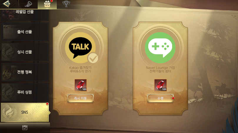 '혜택 - SNS' 보면 카카오톡 즐겨찾기 혹은 네이버 게임 라운지 가입을 하면 루비를 준다. 하지만 그냥 '즉시 이동'만 누르고 창 닫으면 그냥 루비가 얻어진다. 물론 가입하면 좋지만 그래도 여러분들의 시간은 아까우니 즉시 이동만 누르고 도망가자.