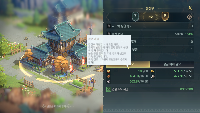 메인 건물을 집정부라고 하는데, 집정부 레벨을 올리기 위해서는 자원도 필요하지만 '문명 훈장'이라는 것이 필요하다. 문명 훈장은 자원지 토벌이나 유적 수호자 정화로 얻을 수 있는데, 자원지 토벌을 하면 좋은 점이 여러가지가 있다. 자원지 토벌을 하면 일일 퀘스트인 영웅 스테미너 퀘스트로 깰 수 있고 자원도 얻을 수 있다.