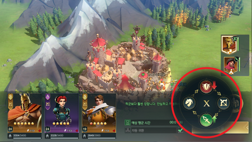 토벌이나 소탕을 하게 되면 소탕 대상이 어떤 군으로 이루어져있는지 좌측 하단에서 확인할 수 있다. 그러면 내가 그 상대에 맞춰서 상성이 좋은 친구로 병사들을 꾸려가면 훨씬 더 좋은 승리와 적은 병력 손실을 가져올 수 있다. 그 기능이 바로 그림에서 보이는 기능이다.