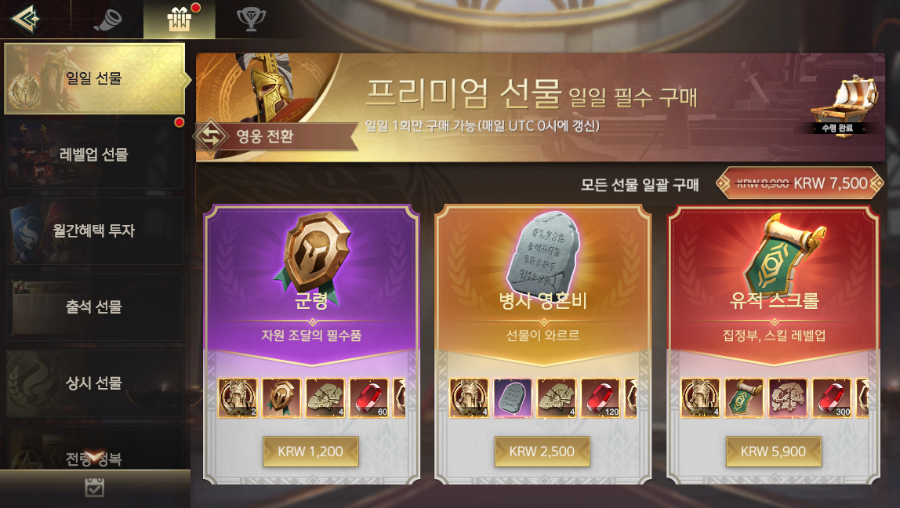 현재 군령과 유적 스크롤을 얻으려면 어떻게 해야하나? 네, 현재로는 과금하는 방법밖에 없습니다. 군령을 하루 1200원, 유적 스크롤은 5900원을 투자해야하고 차라리 그럴거면 하루에 7500원을 그냥 다 쓰는 방법으로 해결이 가능하다. 진짜 사실 하루 한 번씩 더 하는게 큰 차이가 있을거냐라고 생각하면 꼭 그렇지도 않다. 그렇기 때문에 급하신 분들만 과금을 하면 된다.