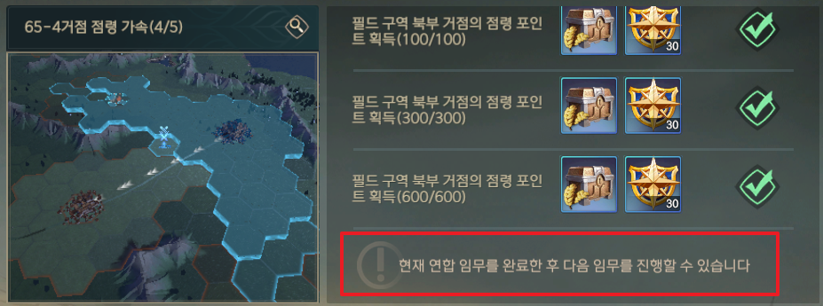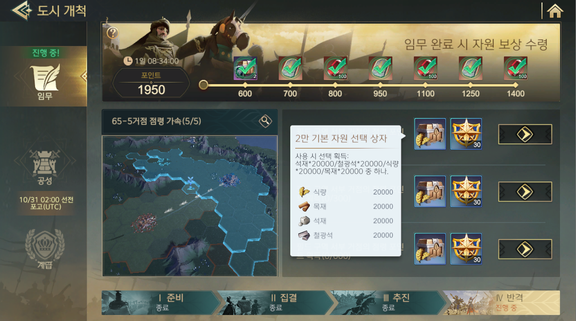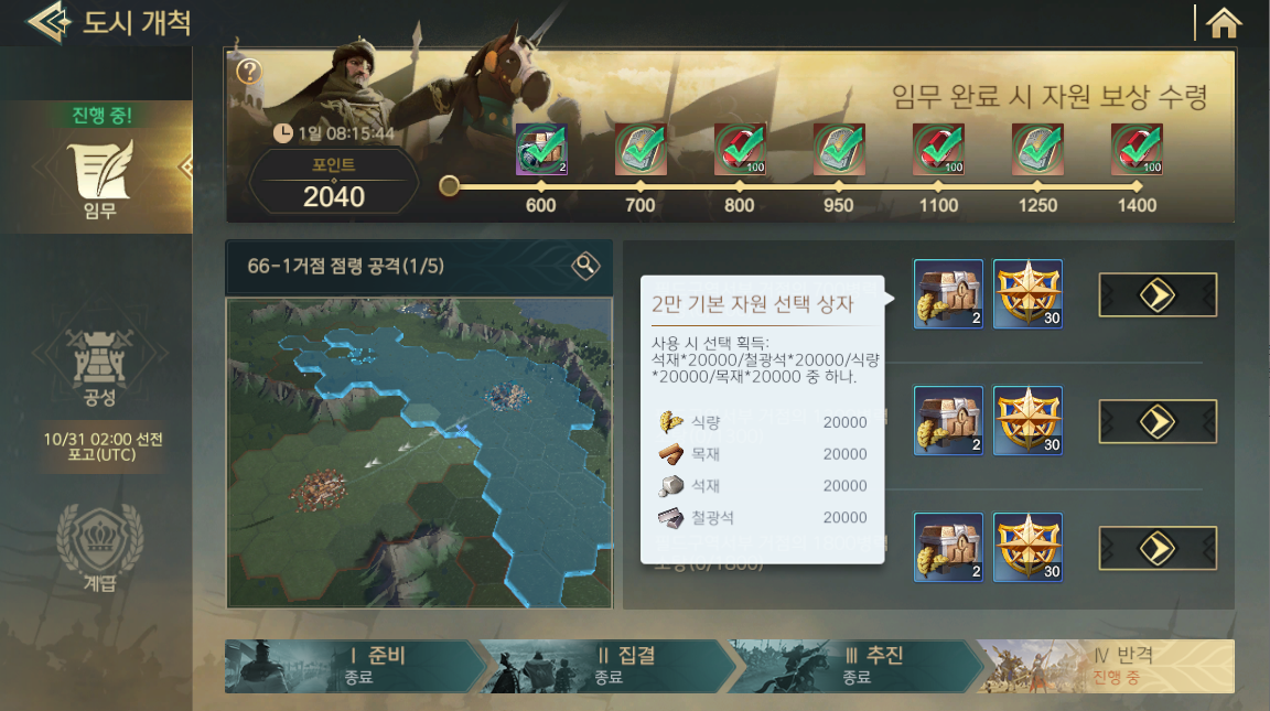 총 하나의 거점에 3개의 퀘스트가 있는데 그냥 얼마나 오래 점령했느냐이기에 보통 3개가 모두 클리어가 된다. 보상으로는 2만 기본자원 선택상자와 도시개척임무 포인트를 준다. 도시개척 임무 포인트는 상기 서브 퀘스트의 보상이기에 해당 보상을 모두 끝냈다면 의미가 없는 포인트이긴 하다.
