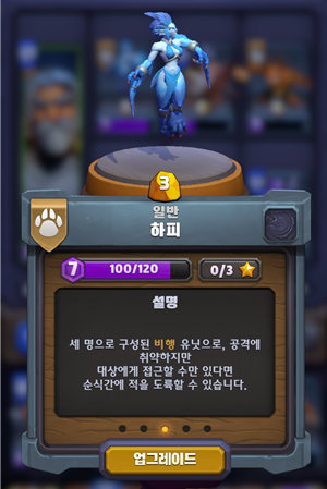 국내외 막론하고 언급되는 하피로 세명으로 소환이 되며 진짜 공격 특화이긴 한데 몸빵이 정말 안되는 친구이다. 그래서 탱커류와 잘 섞어 쓴다면 강한 비행유닛이라고 할 수 있다. 엄청 빠르기도 한데 원거리면 좋겠지만 안타깝게도 근접 딜러이다.