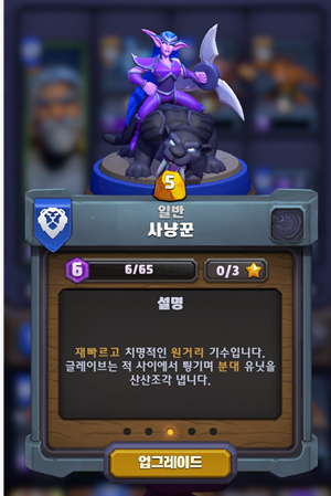 비싼 친구다. 사냥꾼은 5코스트로 아주 비싼 친구다. 사령관이 4코스트니 말이다. 하지만 5코스트 값어치를 하는 친구인데 몸이 좀 약해서 컨트롤 배치만 잘 해주면 무쌍을 찍는데. 데미지도 좋고 뮤탈처럼 3쿠션에다가 빠르기까지 해서 탱커 믿고 까무는 뒷라인을 녹이는 역할을 한다.
