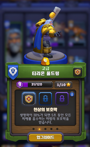 진급을 하게 되면 특성을 찍을 수 있는데, 천상의 보호막, 신성화, 빛의 축복 중에서 고르게 된다. 대부분 추천 특성은 천상의 보호막으로 생명력 30%가 되면 5초동안 모든 피해를 흡수하는 마법의 보호막을 얻는 특성이다. 3개를 다 연다면 뭐 뭘 찍어도 상관없겠지만 무과금 유저들에게는 특성 하나하나가 소중하다. (추천 순서: 천상의 보호막 - 빛의 축복 - 신성화)