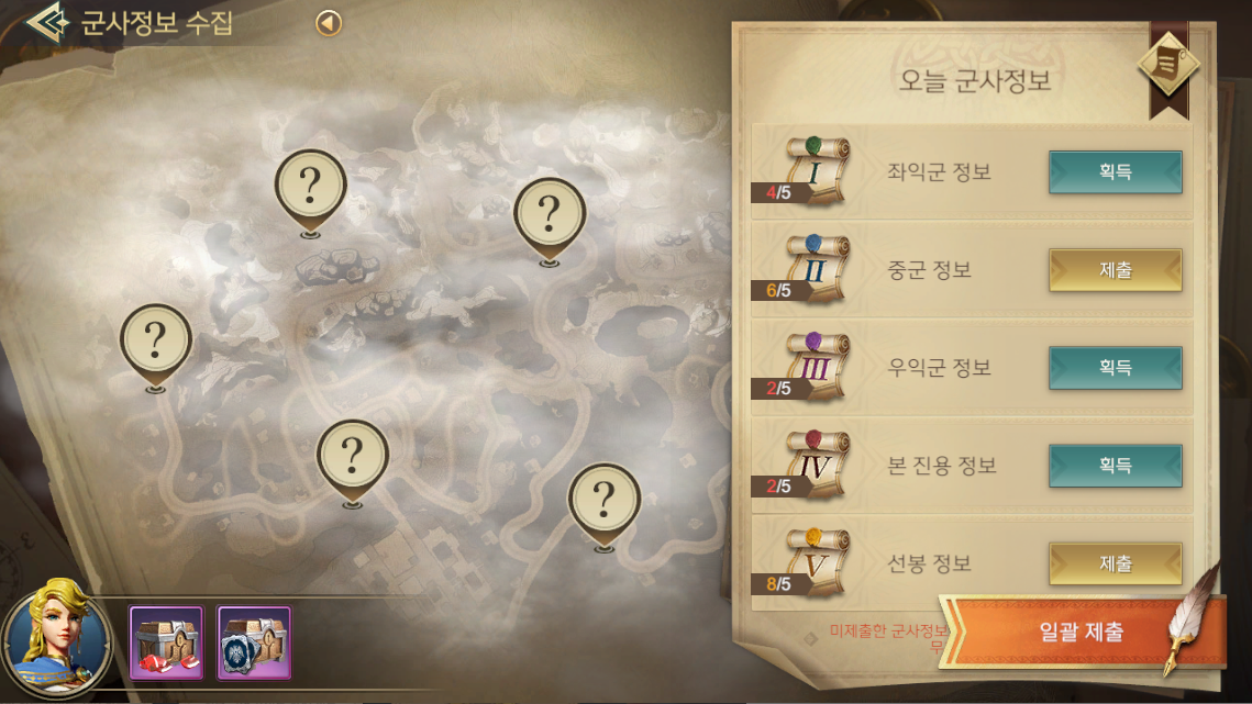 정보라 함은 일상 퀘스트 완료 시 주는 정보들을 토대로 군사 정보를 제출할 수 있다. '퀘스트 - 일상 - 군사정보 수집'에 들어가면 오늘 내가 모은 군사정보들을 확인할 수 있다. 5개씩 모아서 제출하면 자투리 정보들이 남게되는게 어차피 하루 지나면 모든 정보들이 사라지기 때문에 친구나 연합원들에게 나눠줄 수 있다.