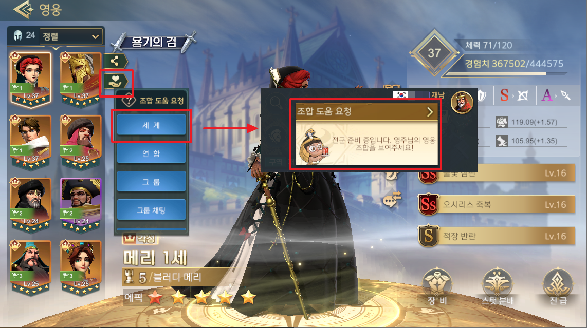 실제로 영웅 탭에서 내가 아래 그림처럼 조합 도움 요청을 보내면 월드에 조합 도움 요청이라는 란이 뜨고 조합을 맞춰서 보내주면 조합 프리셋을 할 수 있는데, 최근 채팅을 보면 정말 안올라오기에 조정 마스터를 얻기는 어렵다. 그래서 친구랑 같이 한다면 친구와 함께 서로 공유하는 방식으로 깨야할 것 같다. 나도 이 달인임무는 그냥 없다고 생각하고 플레이한다.