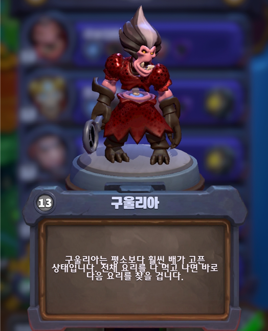 이 친구는 설명에도 나와있듯 평소보다 배가 고픈 상태의 영웅이다. 능력 자체가 너무나 신박하기에 처음 맞으면 당황스럽기는 하다. 오는 적을 뭐로 만드는지는 모르겠지만 고코스트고 저코스트고 상관없이 계속 변이시켜서 잡아먹는다. 잡아먹으면 다행인데 그 잡아먹으면 체력이 차고, 체력만 차면 다행인데 이 친구가 배부르면 레벨을 뻥튀기하여 내 타워로 걸어 내려온다. 공포 그자체.