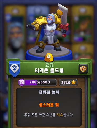 티리온이 이렇게 추앙받을 수 있었던 이유는 바로 스킬 때문이지 않을까 싶은데 지휘관 능력은 '성스러운 빛'으로 주위 모든 아군 유닛을 치유하는 능력이다. 사실 힐러를 엄청 좋아하기 때문에 티리온을 키우는 것도 있겠지만 실제로도 PVE 할 때 이 힐링 능력은 정말로 좋은 능력이라고 할 수 있다.