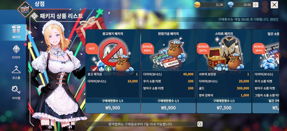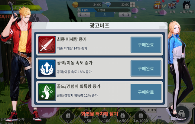 흔히 말하는 광제, 광고제거 패키지는 게임을 이용함에 있어서 보통 부지런하지 않는 사람이 아닌 이상은 구매를 해서 진행을 한다. 다양한 아이템 구매 뿐 아니라 광고 버프를 무료로 이용할 수 있다는 것이 가장 큰 장점인데, 다이아 보너스까지 받을 수 있다면 이보다 더 좋은 것은 없지 않을까 생각한다.