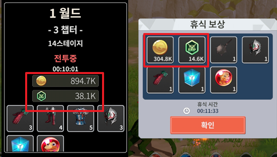 - 오프라인 보상 - 11분 기준 304.8K 골드 / 14.6K 경험치