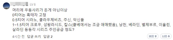 공식 라운지에서 정말 대단한 의견을 주시는 '번뇌'님이 계시는데 말씀이 좀 강하시긴 해도 CBT 경험도 있으시고 지금 현재에도 꾸준히 좋은 정보를 주고 계신다. 오픈 후 1달 뒤에 나오는 캐릭터들의 성능이 좋다고 하는데, 아래 그림을 참고하여 조금 더 보강하는 것도 좋아보인다. 흑태자 고정. 나도 가지고 싶다.