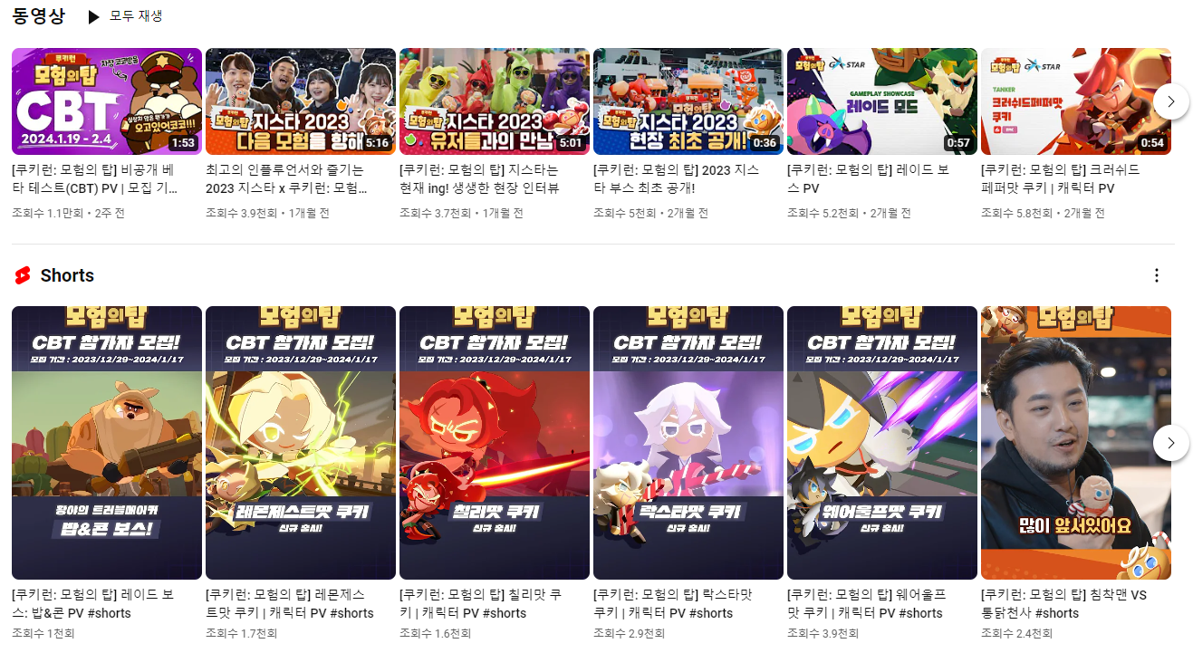 솔직히 게임 유튜브 치고 잘되는 걸 못봤다. 대부분 광고 영상을 올리기 위해 제작된 채널이라 구독자수도 그렇고 조회수도 그렇고 화력이 약한 경우가 대다수이다. 근데 쿠키런 유튜브는 벌써 1만명 구독자 달성이 얼마 남지 않을 정도로 많은 게이머들이 기대하고 있다.
