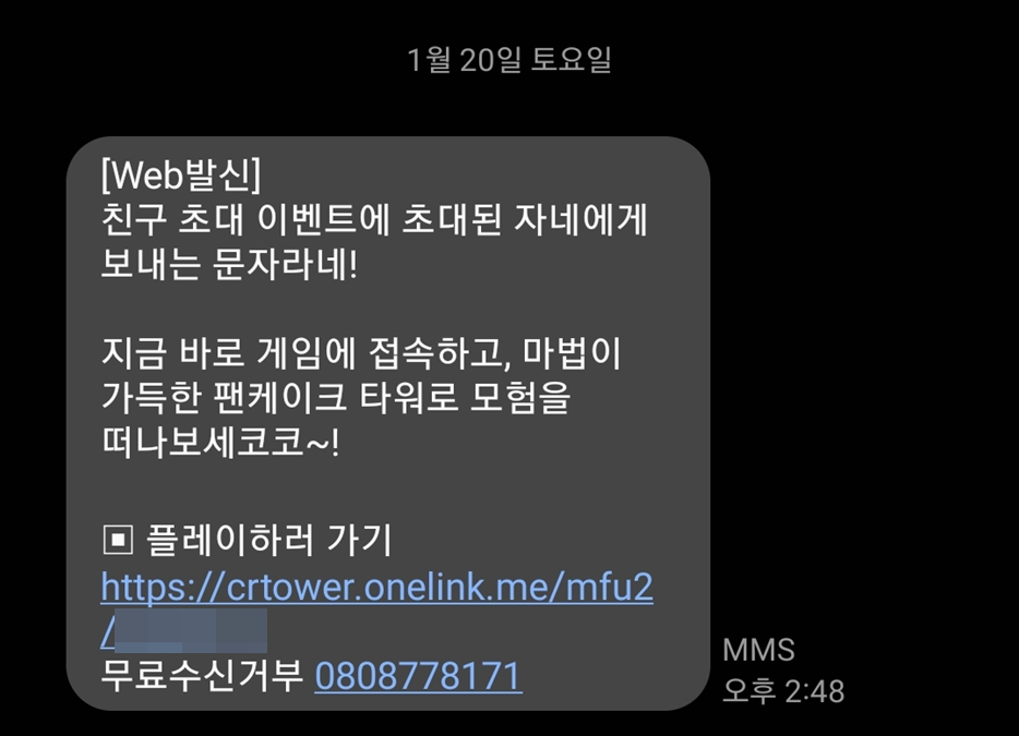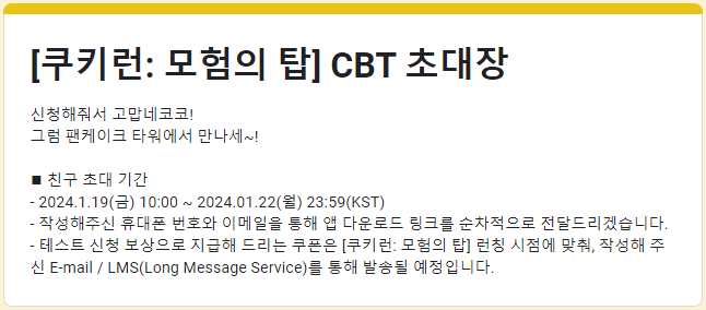 이렇게 초대 코드와 함께 쿠키런 모험의 탑 CBT 초대장을 사용할 수 있게 되었다. 사람이 손수 하는 듯 한데, 테스트 등록이 완료가 되면 문자와 함께 다운로드 받을 수 있는 링크를 문자로 보내준다. 그렇기에 핸드폰 번호와 이메일 주소는 실수하지 말고 작성해야한다.