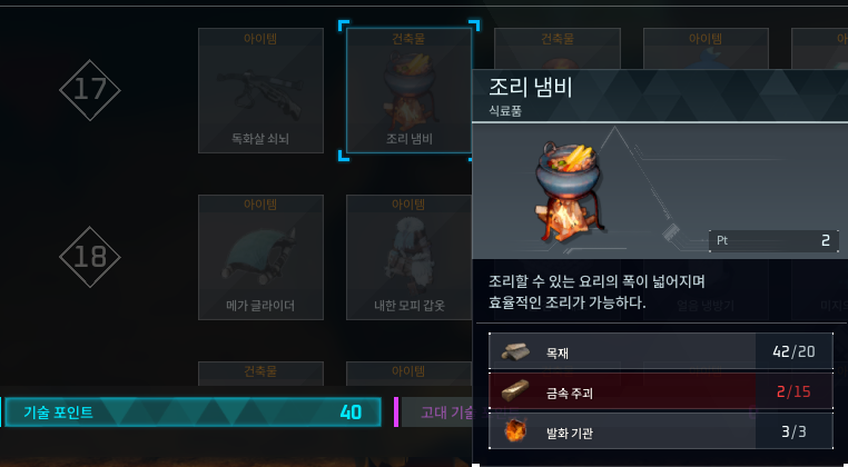 - 조리냄비 제작 재료: 레벨 17, 목재 20개, 금속 주괴 15개, 발화 기관 3개.