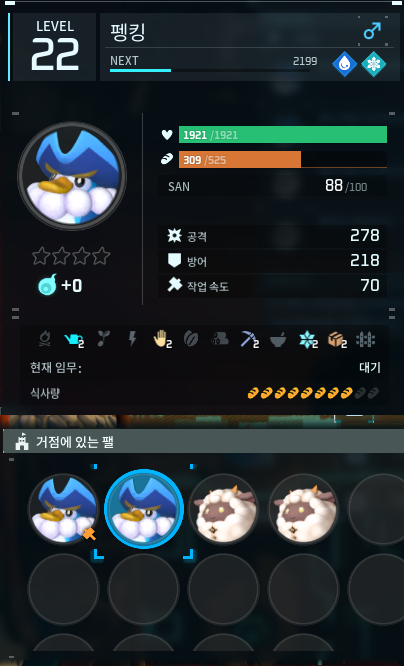 거점에 현재 들어가있는 팰은 총 4마리이다. 펭킹은 알 부화로 얻은 2마리라 어디서 잡는지는 모르지만, 추후에 펭킹 서식지를 알아내게되면 많이 잡아서 넣어둘 생각이다. 펭킹은 수작업과 운반, 그리고 채굴까지 가지고 있는 팰이다. 내가 가지고 있는 팰 중에서는 채굴하는 친구가 이 친구가 거의 유일해서 넣어두었다.