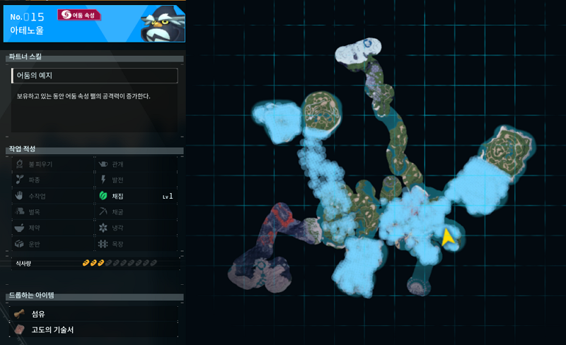15번 팰은 아테노울 어둠속성 팰이다. 밤에 거점을 다니다가 초반에 발견한 친구로 이때 알았다. 밤에만 등장하는 팰이 있다는 것을. 어둠 속성 친구들은 밤에만 등장한다. 파트너 스킬은 '어둠의 예지'로 어둠 속성 팰의 공격력을 증가시켜준다. 작업 적성도 채집 1개 밖에 없어서 굳이 쓰지는 않는다.