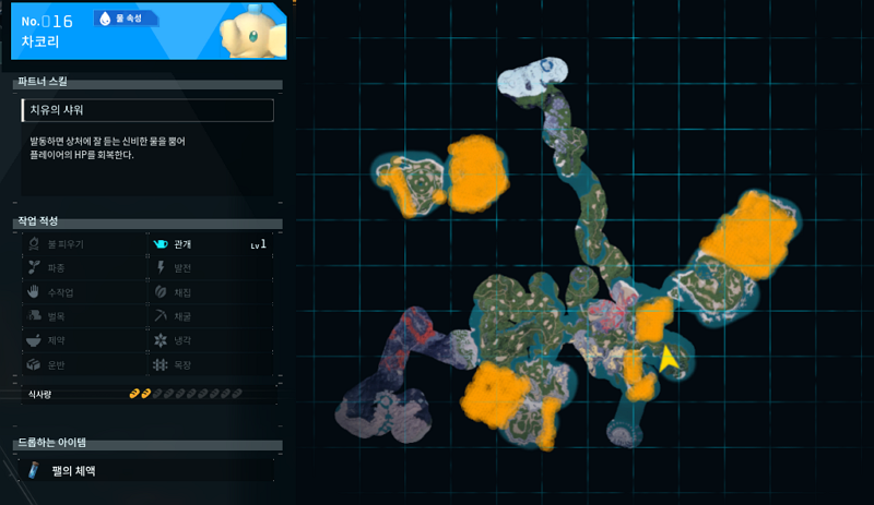 16번 팰은 차코리 물속성 팰이다. 팰의 체액을 얻기 위해서 조금 잡기는 했으나 거점에서는 보기 힘든 친구이다. 관개가 1개 붙긴 하지만 관개 2레벨 짜리도 많아서 작고 귀여운 차코리는 쓸 일이 없다. 다만 파트너 스킬로 치유를 가지고 있어서 어려움 난이도를 깰 때는 상용해보고 싶기는 하다. 지금은 쉬움 난이도라 안아프니 말이다.