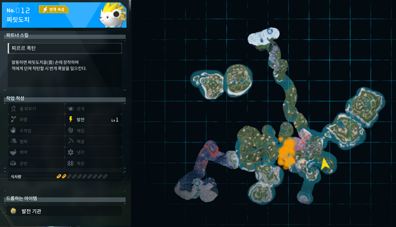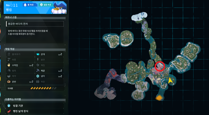 팰월드 11번 팰은 펭킹이다. 솔직히 펭킹이 초반 거점의 패왕이 아닐까 생각이 된다. 모든 작업 적성이 2레벨로 붙었으며, 중반 광석 거점에서 혼자서 캐리하는 펭킹이라고 할 수 있다. 초반에는 포획을 하거나 아래 그림의 빨간 원의 던전에서 잡는 방식이 어려울 수 있다. 그래서 '물 속성' 알들을 모아서 부화하면 얻을 수 있다.