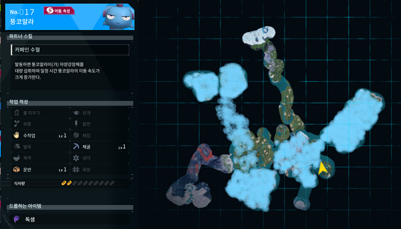 뚱코알라는 팰월드의 17번 팰이다. 어둠 속성 같지 않게 파란색이라 찾는데 시간이 좀 걸렸던 것 같다. 11번부터 20번까지 팰 중에서 제일 마지막에 잡았던 팰이다. 파트너 스킬이 카페인 수혈인데 일정시간 뚱코알라의 이동속도가 크게 증가하는 스킬이다. 중요성을 잘 모르겠어서 그냥 설명만 적어놓았다.