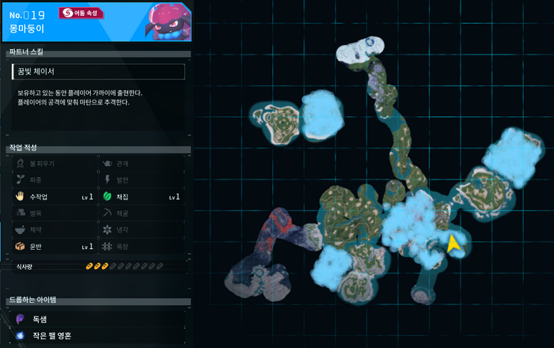 19번 팰은 몽마둥이로 어둠속성이다. 초기 거점 근처 밤에 돌아다녀보면 쉽게 만날 수 있는 친구라 포획하기는 어렵지 않아보인다. 작업 적성이 수작업과 채집, 운반이라 초반에 사용할만 하다고 생각한다. 드롭하는 아이템은 독샘인데 독 관련 아이템을 만들지 않아서 굳이 많이 잡지는 않았다.