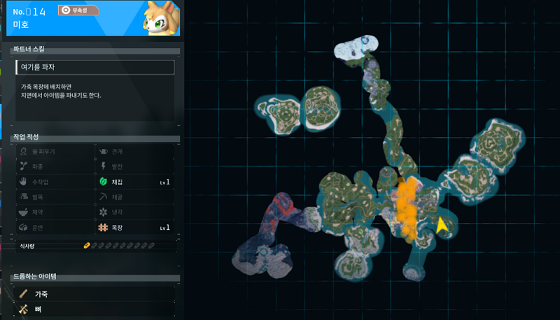 팰월드 14번 팰은 미호이다. 무속성이며 적성이 채집과 목장을 가지고 있는 귀여운 팰이다. 파트너 스킬이 여기를 파자인데 지면의 아이템을 파내는 스킬이다. 아마 극후반에 고인물들에 의해서 미호가 파내는 아이템 중 전설급이 등장한다는 사실을 발견하기 전까지는 쓰지 않을 듯 하다.
