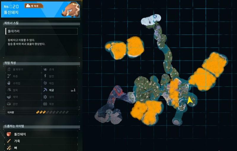 이번 포스팅에 마지막 20번 팰은 돌진돼지이다. 초반에 이 친구를 타고 다녔기에 애착이 많이 가는 친구이다. 초반 채굴을 위해 풀어놓기는 했지만 펭킹을 만나고부터는 쏙 들어간 팰이다. 드롭하는 아이템이 고기랑 가죽 그리고 뼈여서 음식 구할때 잡으러 다니곤 했다.