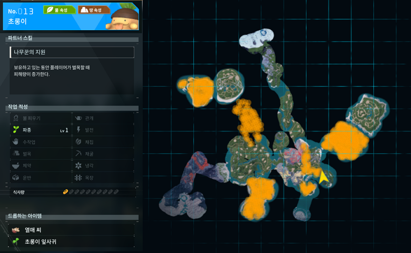팔월드 13번 팰은 초롱이이다. 파종 적성만 가지고 있어서 초반에 밭 꾸리기에는 나쁘지 않은 팰이라고 생각하고 초반에 잠깐 쓰고 있다. 파트너 스킬인 나무꾼의 지원으로 벌목할 때 효율을 높혀주는 역할을 하지만 굳이라는 생각을 하긴 한다. 근데 5마리 다 넣으면 또 어떻게 될 지 모르니 실험을 한 번 해봐야겠다.