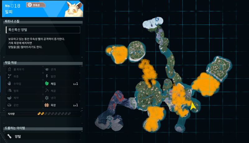 양처럼 안생겼지만 양털을 드롭하는 밀피가 18번 팰이다. 파트너 스킬이 푹신푹신 양털인데 무속성 팰의 공격력을 증가시키고 목장에 배치하면 양털을 떨어트린다. 누가봐도 양이 아닌데 양털을 드롭한다. 작업 적성은 채집과 목장이라 양털이 필요한 경우에는 사용해도 좋을 것 같다.