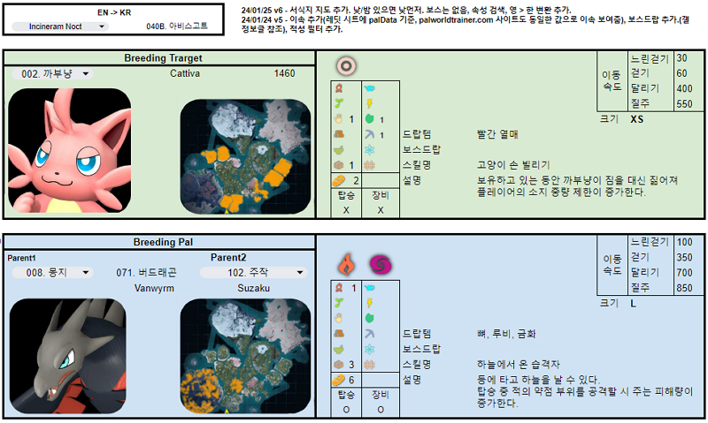 아마 팰월드의 최종 컨텐츠는 교배가 아닐까 생각이 된다. 내가 잡기 어려운 팰들도 교배를 통해서 다양한 팰들을 추출해 낼 수 있다. 이미 많은 해외 국내 고수분들이 다양한 방식으로 팰의 교배 방식을 제공하고 있고 그 교배표는 우리들에게 일용한 양식이 되고 있다. 모든 교배 조합을 리스트로 정리해서 멋지게 무료로 제공하고 계신다.