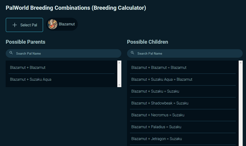 교배 재료 찾기는 내가 부화하고 싶은 재료를 선택 후 부모 성질을 찾아주는 페이지이다. 내가 가지고 있는 것들을 활용하는 좋은 방법이며, 1티어라고 불리는 팰들을 찾기 위해서 필요한 페이지이다. 정말 세상에는 능력자들이 많으신 듯 하다. 덕분에 편하게 팔월드 즐기고 있습니다.