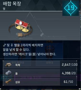 * 배합 목장 건축 재료: 목재 100개, 돌 20개, 섬유 50개